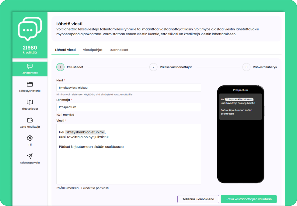 Viestien lähettämiseen tarvitset krediittejä. Yksi krediitti vastaa yhtä normaalimittaista tekstiviestiä.